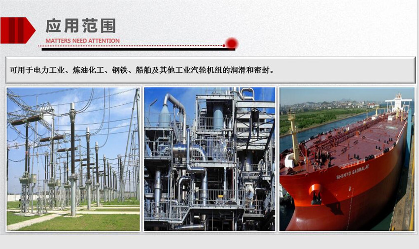 可用于電力工業(yè)、煉油化工、鋼鐵、船舶及其他工業(yè)汽輪機組的潤滑和密封。